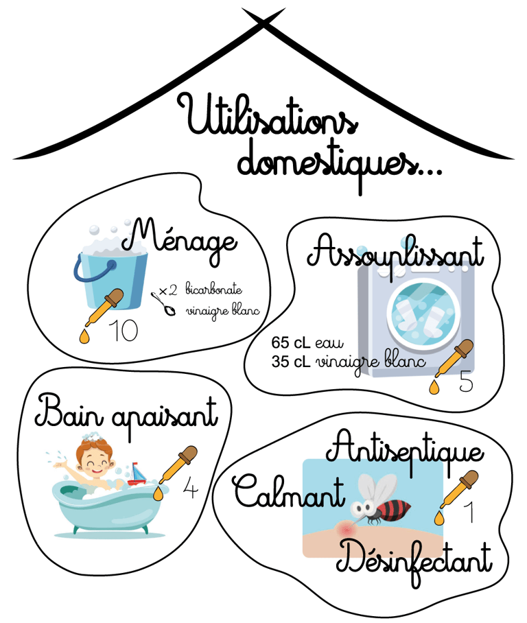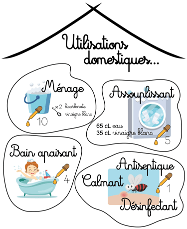 Une huile essentielle omniprésente à la maison. En dehors d'un usage parfumant et désodorisant (diffuseur à parfum, vaporisation dans les armoires...) on peut l'utiliser dans bien d'autres situations.